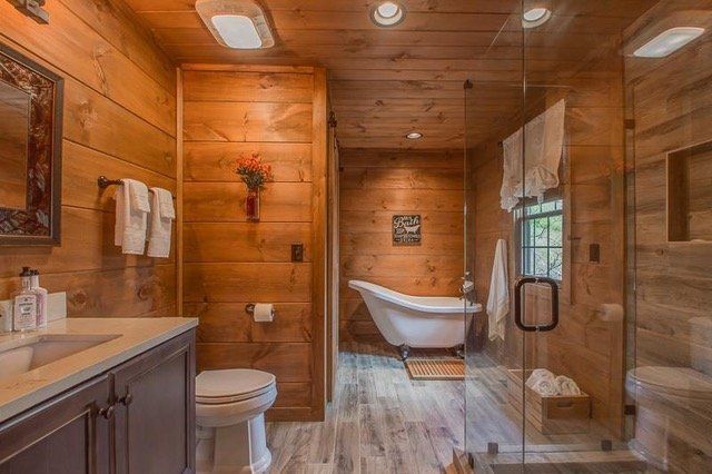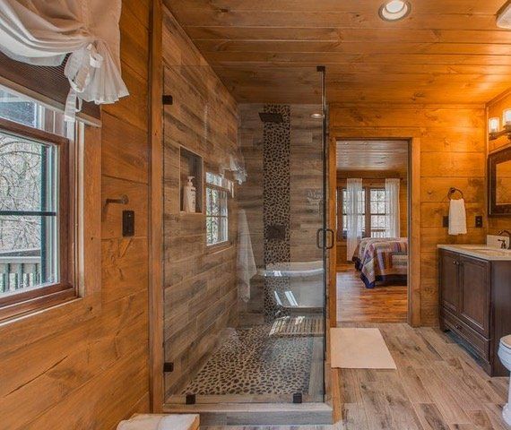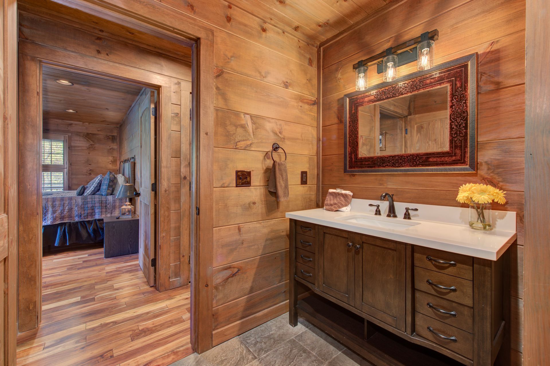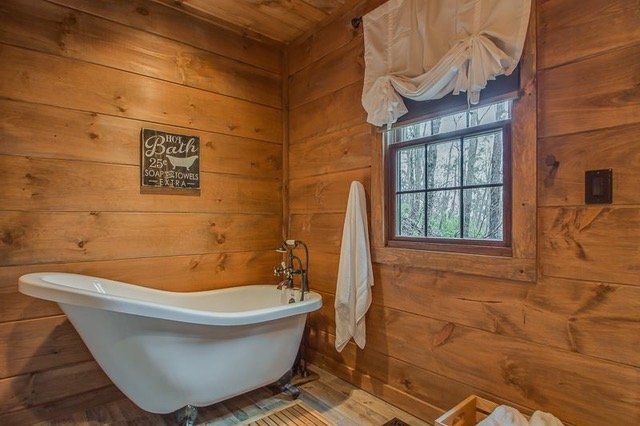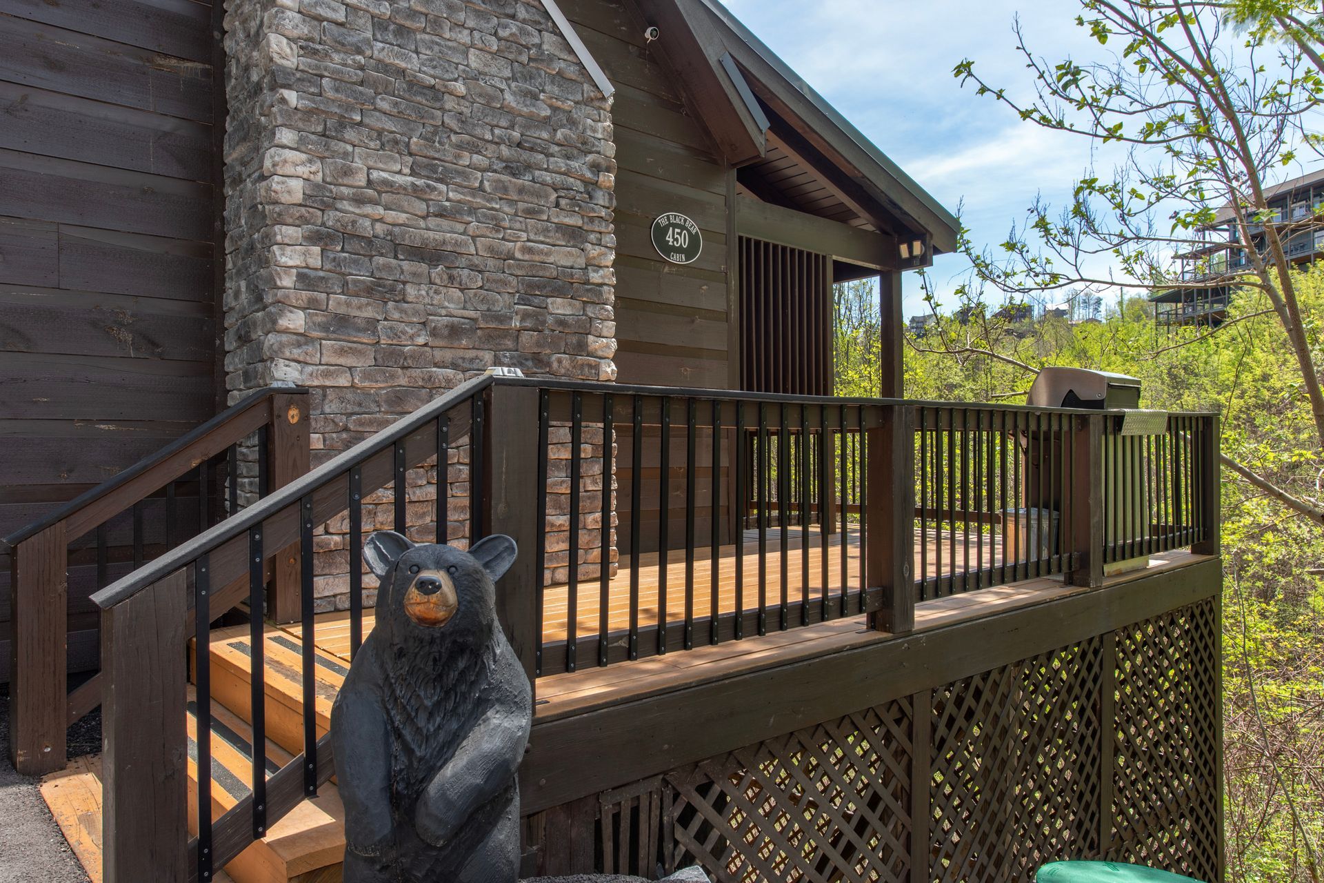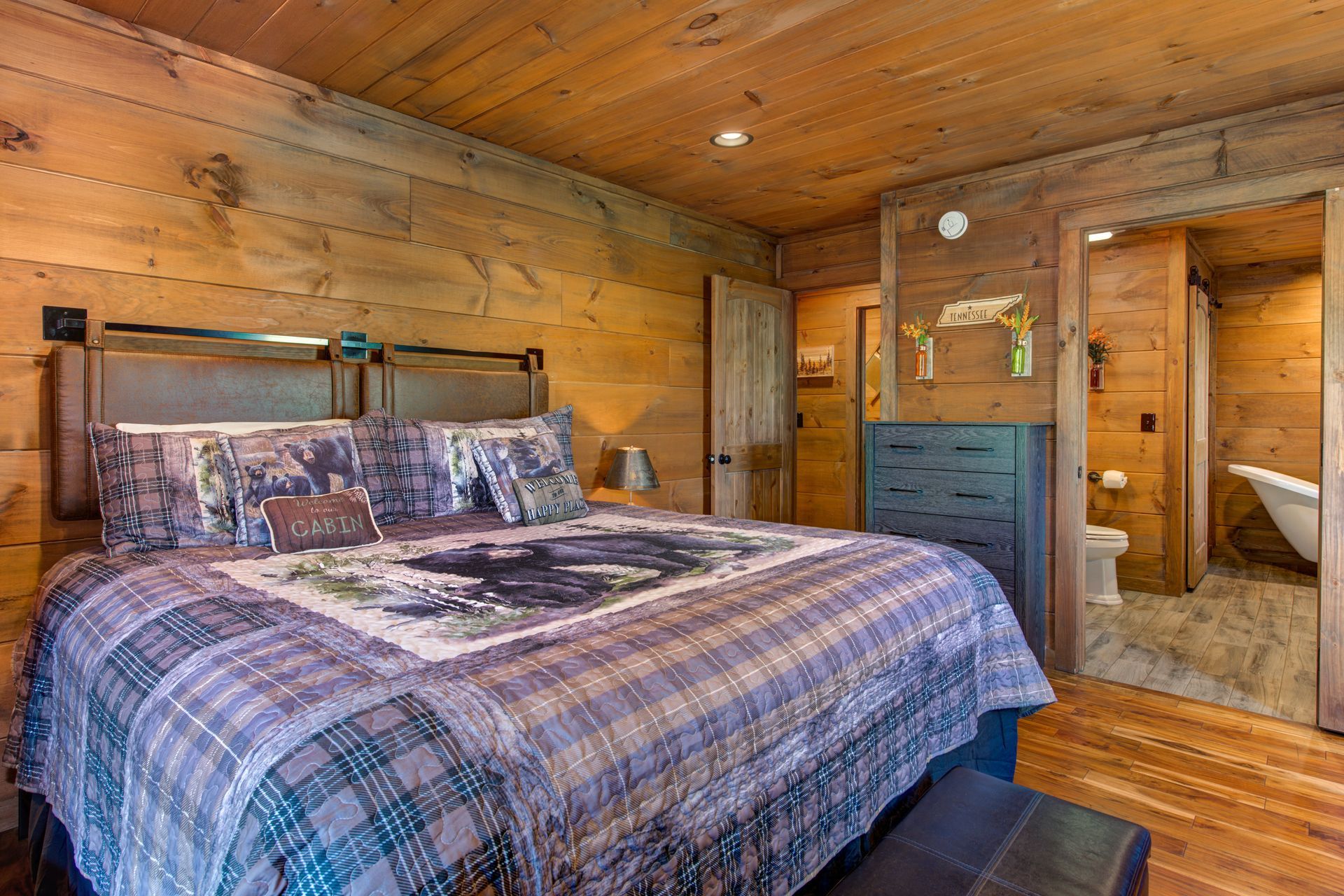 The Black Bear Cabin is our two-bedroom 2.5 Ba luxury cabin featuring a master suite that includes a cozy king-sized bed, private balcony, and luxury bath with tasteful rustic, vintage, and spa-like features. Also, an upstairs guest suite includes a cozy queen size bed and a convenient guest bath. Additional cabin features include a deck-side-hot-tub, an upstairs vintage game console, and beautiful decor.