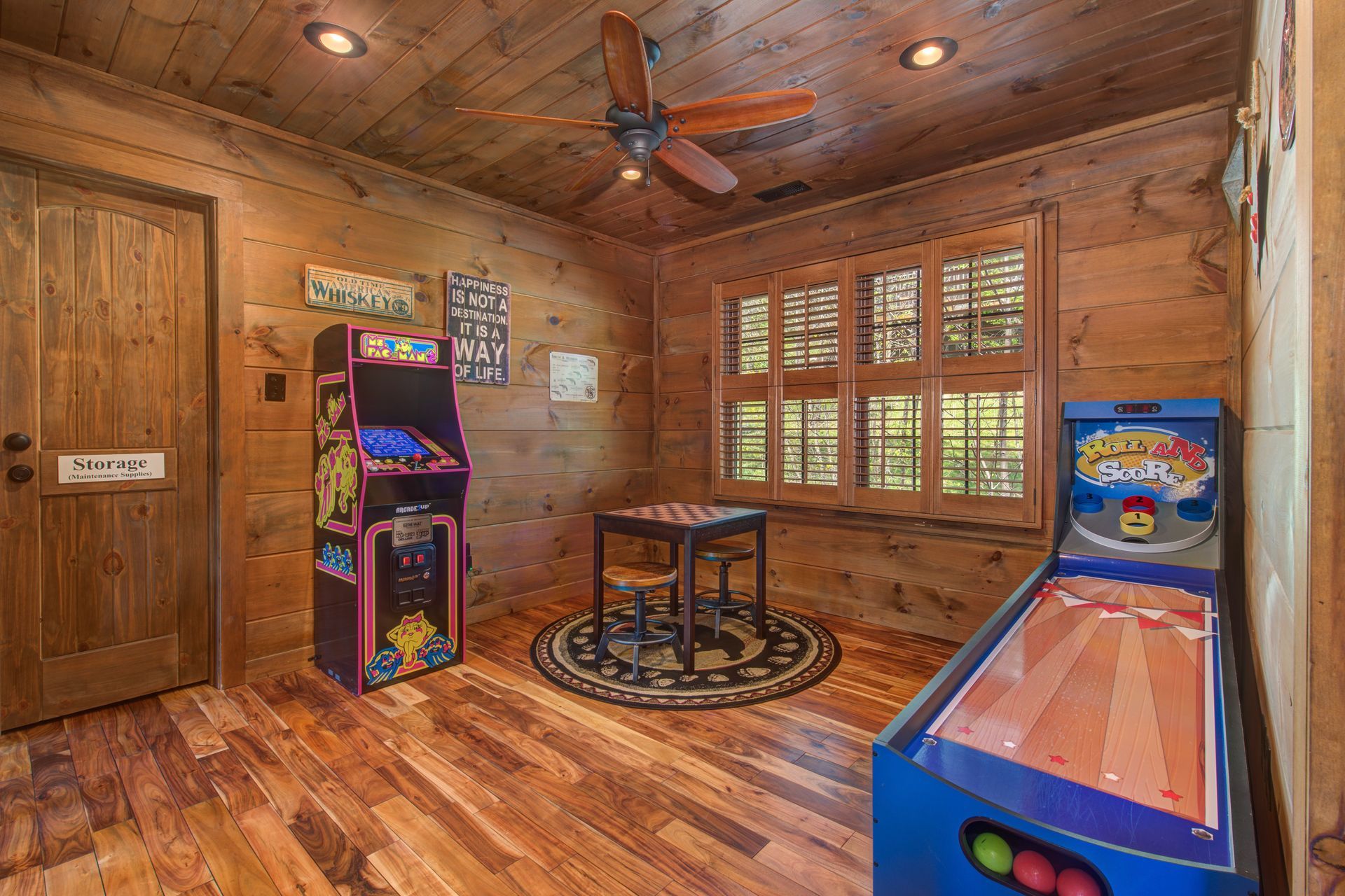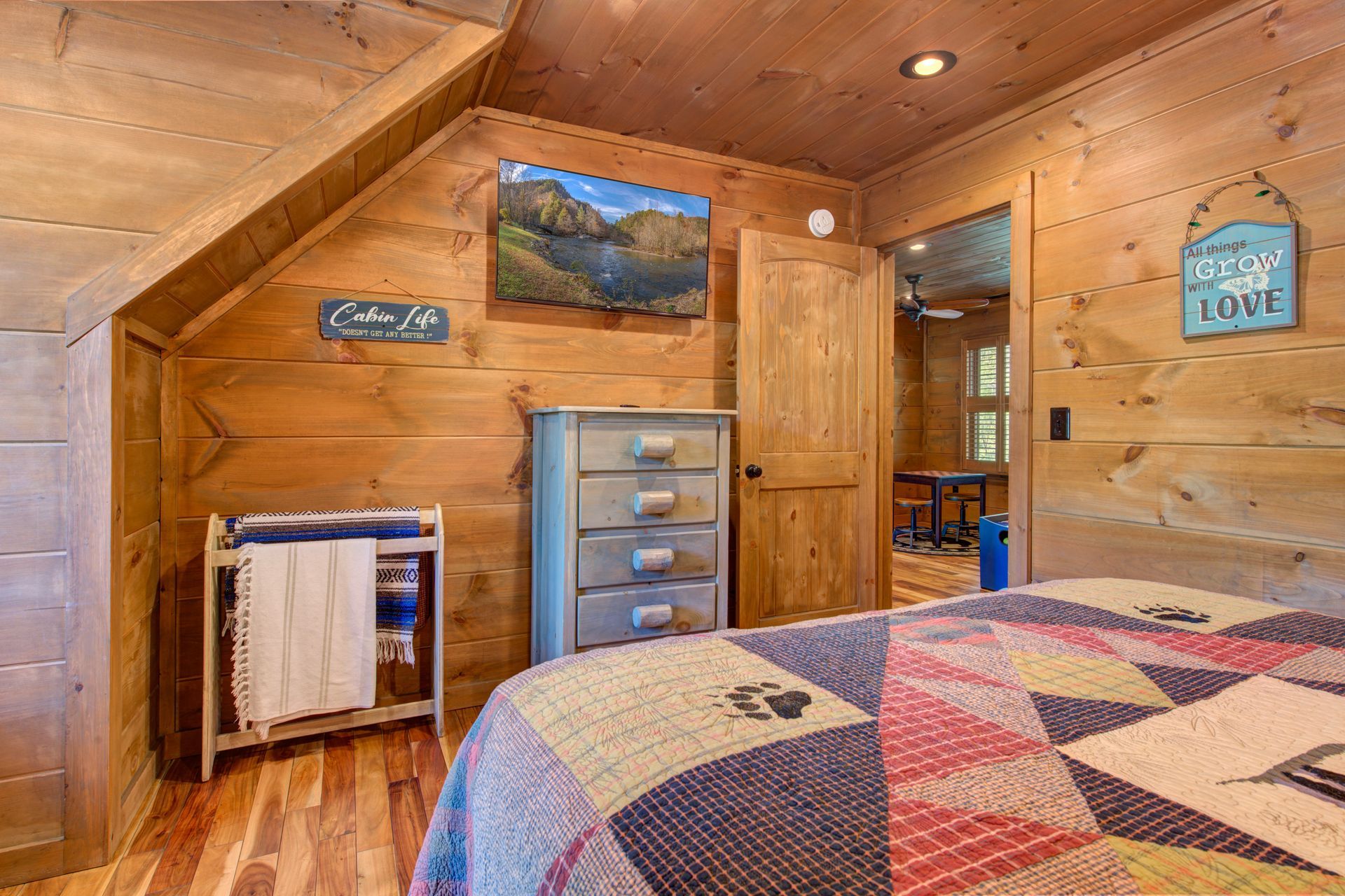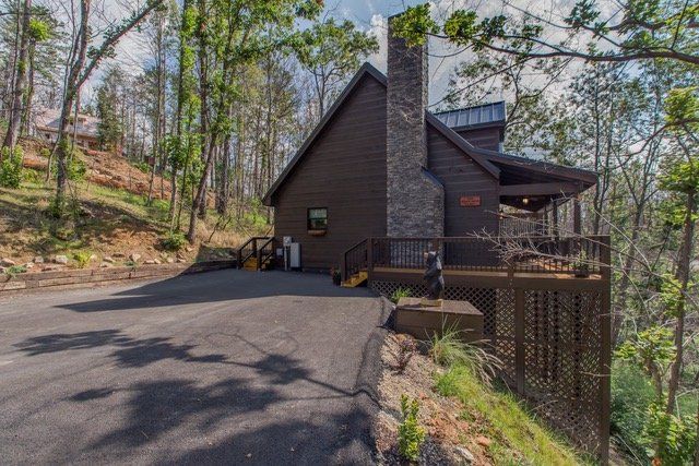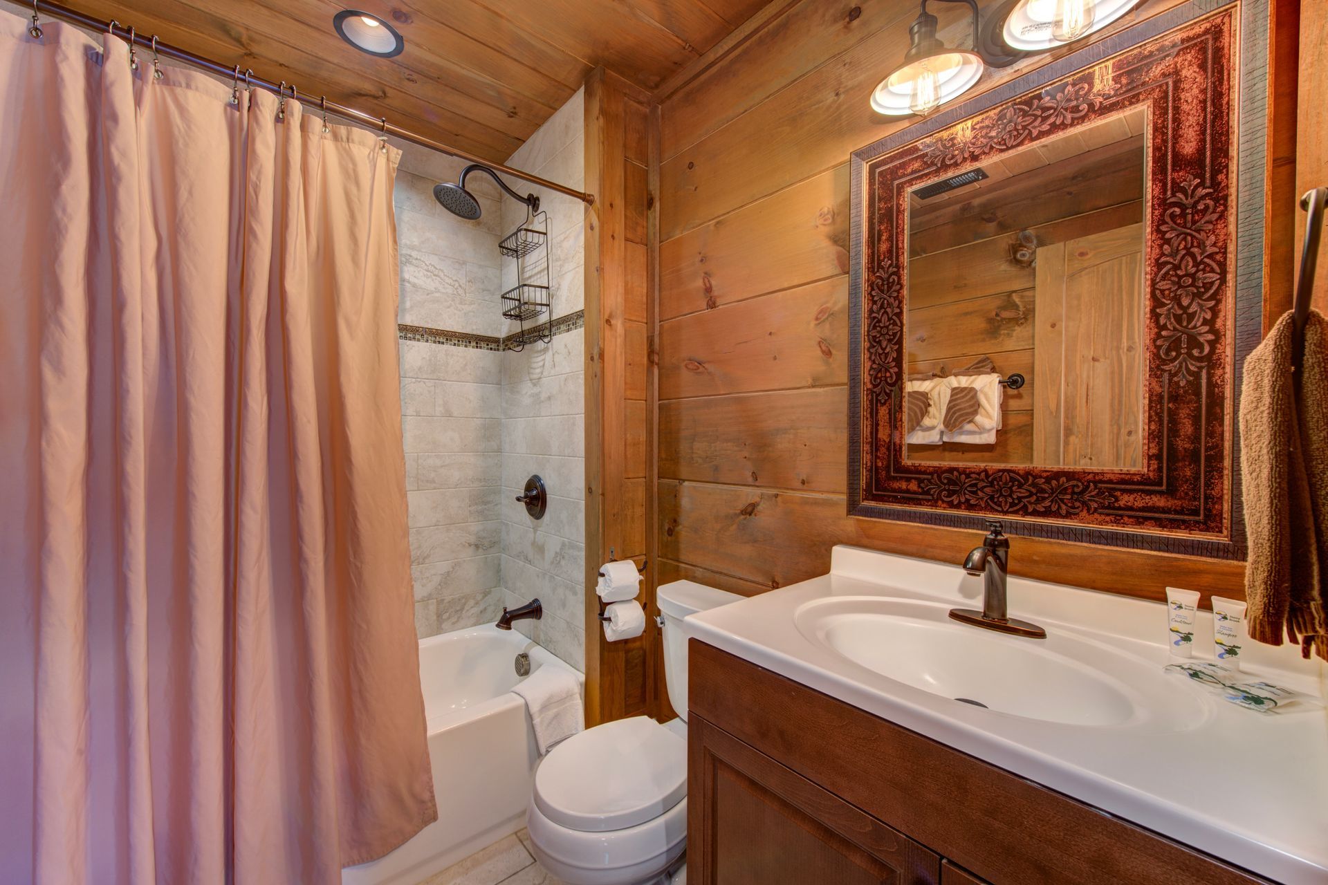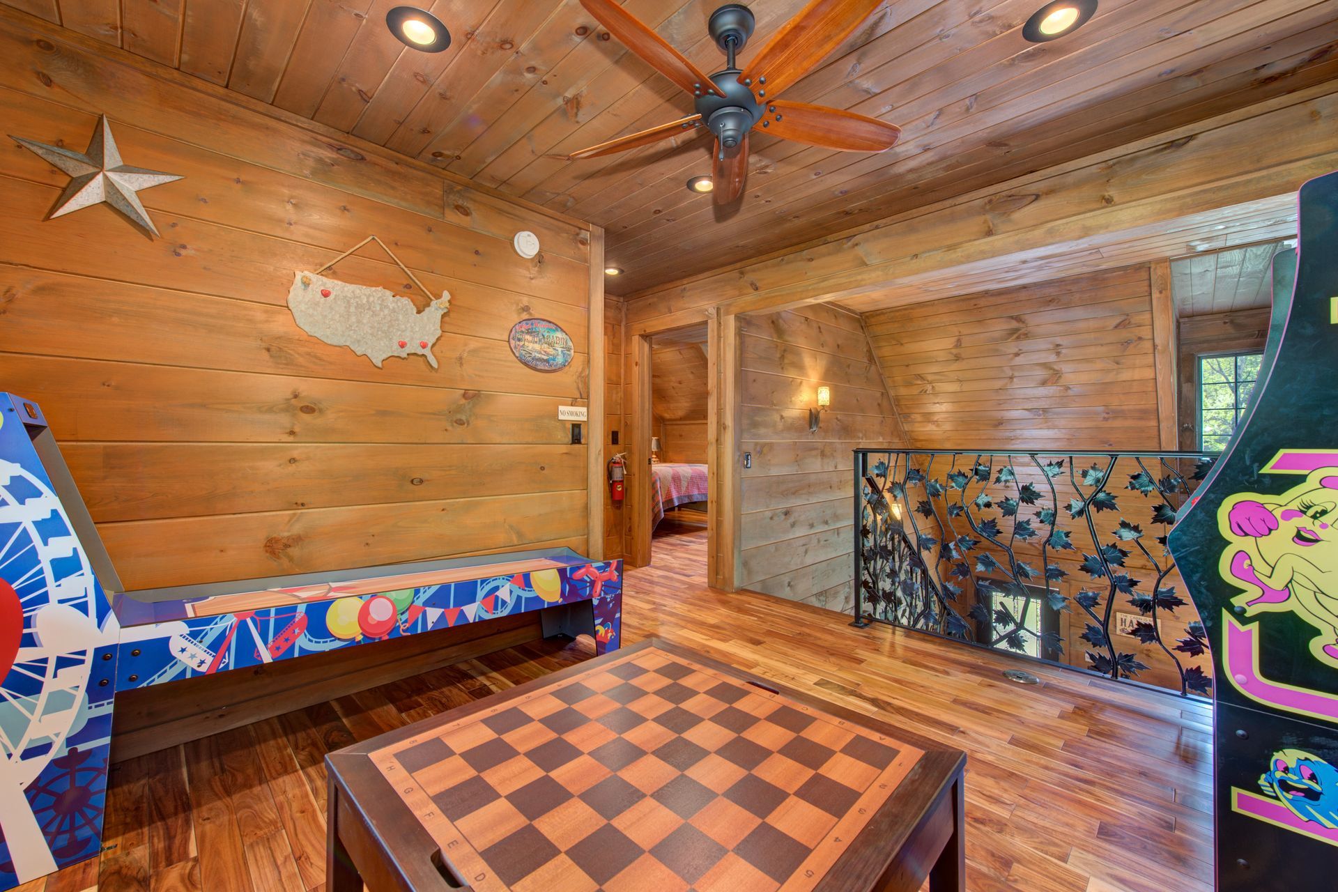 The Black Bear Cabin is our two-bedroom 2.5 Ba luxury cabin featuring a master suite that includes a cozy king-sized bed, private balcony, and luxury bath with tasteful rustic, vintage, and spa-like features. Also, an upstairs guest suite includes a cozy queen size bed and a convenient guest bath. Additional cabin features include a deck-side-hot-tub, an upstairs vintage game console, and beautiful decor.