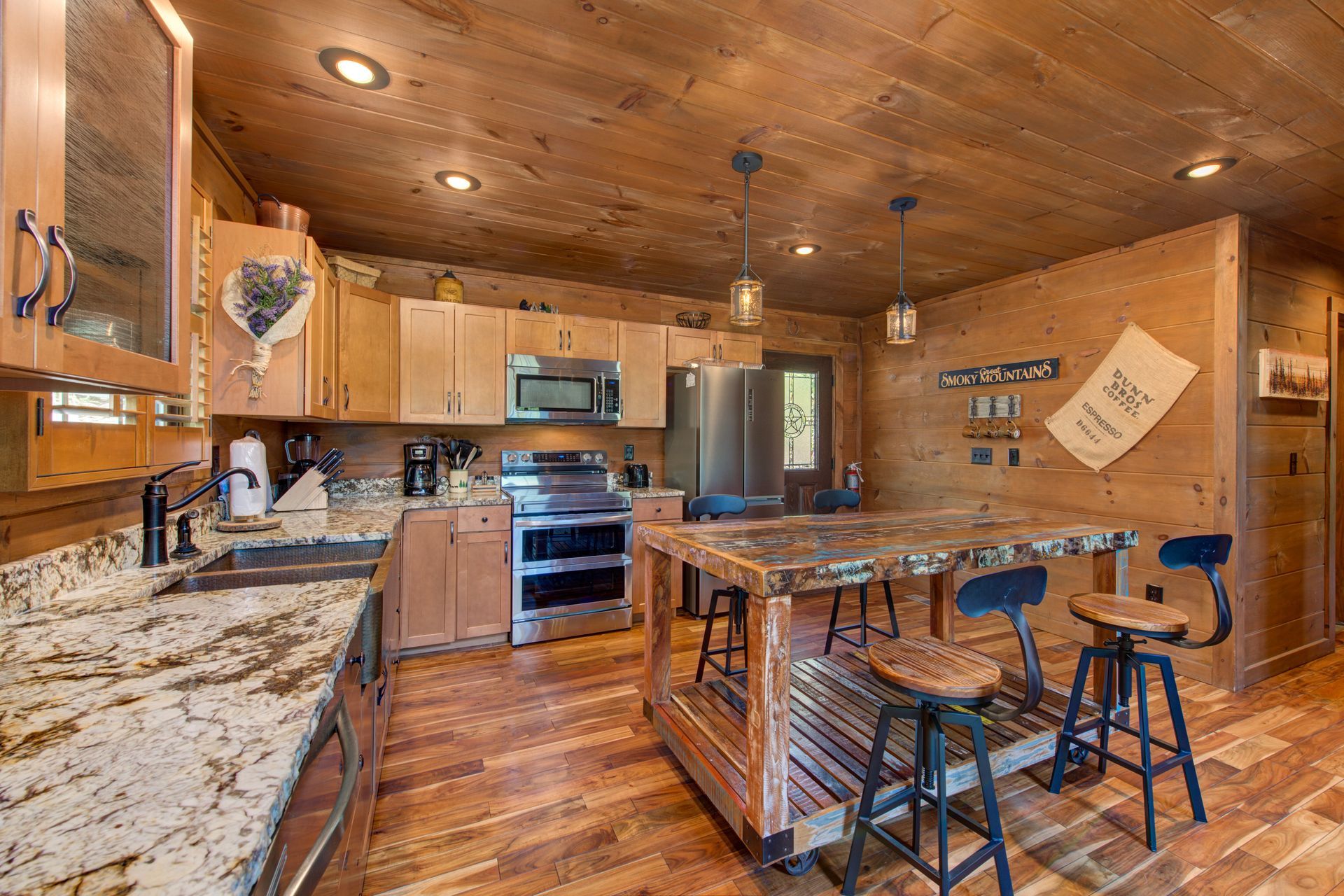 *The Black Bear Cabin has granite counters featuring a chiseled stone edge, a hammered copper sink, stainless steel appliances, a stone-accented gas fireplace, wood throughout, and more.